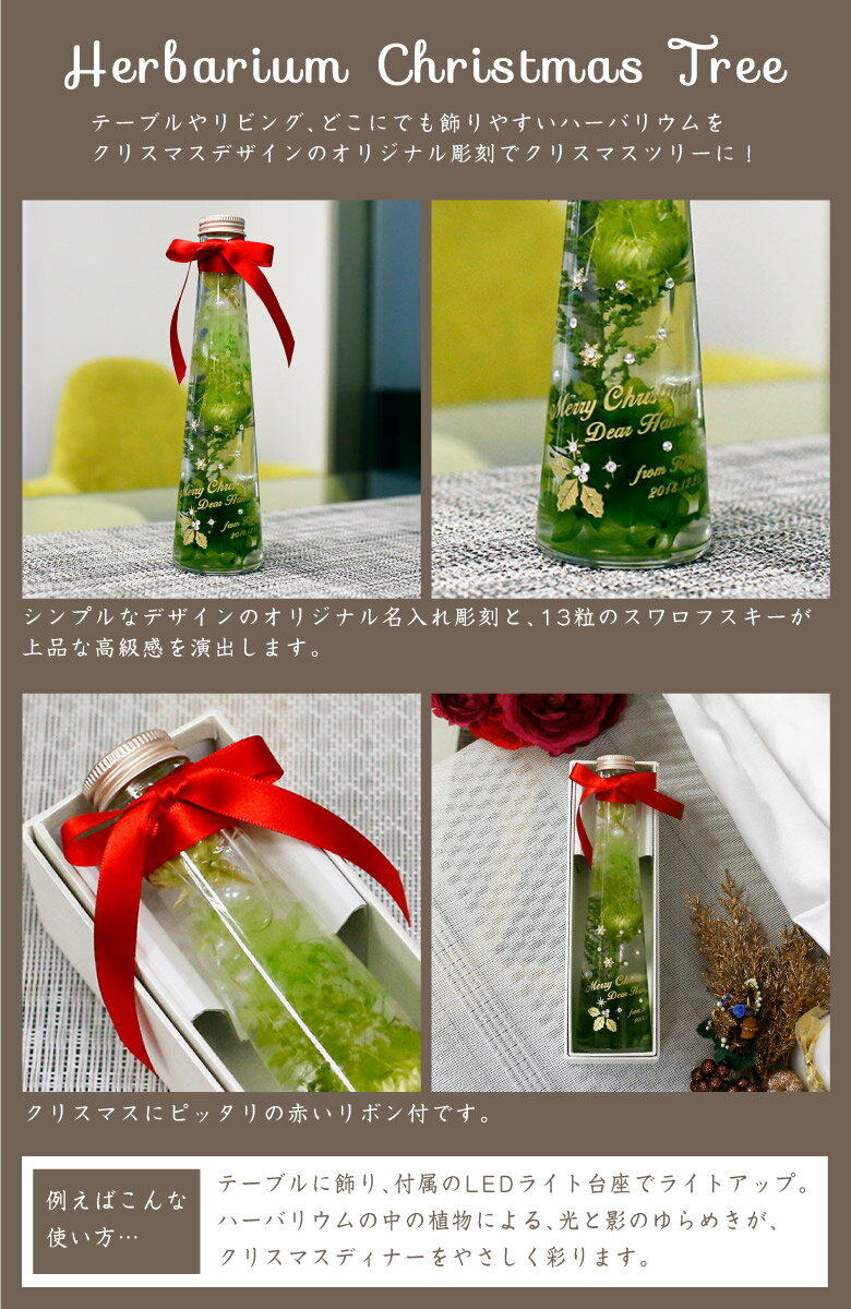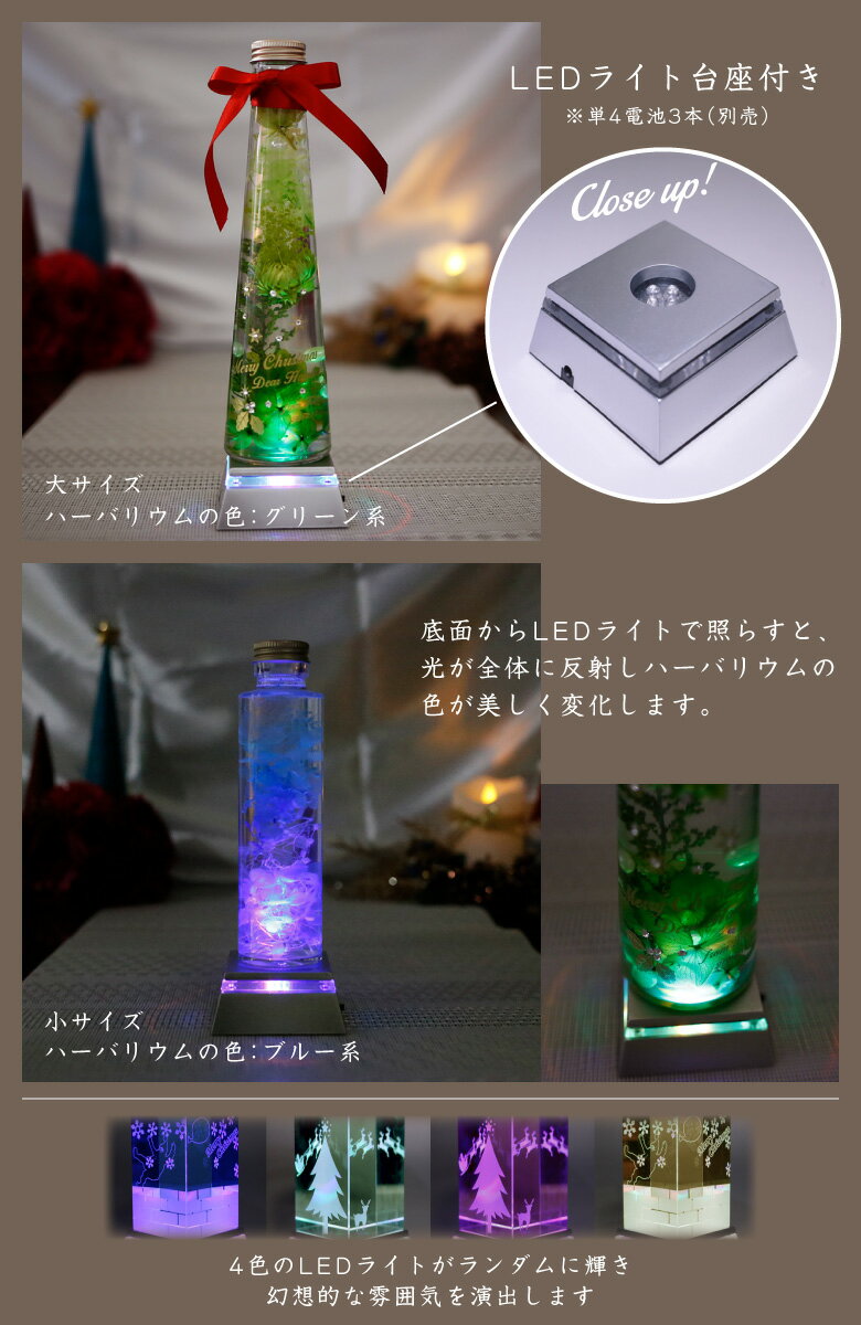 名入れ彫刻、スワロフスキー13粒装飾無料です!! ちょっとしたスペースにも飾ることができるサイズなので、卓上のクリスマスツリーにお勧めです! 材 質 ハーバリウム(ガラス瓶・プリザーブドフラワー) サイズ 【小:高さ17cm x 幅4.5cm】【大:高さ22cm x 幅5.8cm】 包装 箱入り ハーバリウムとLEDライトの台座がセットになった「クリスマス・ハーバリウム」です。